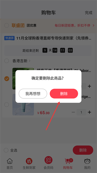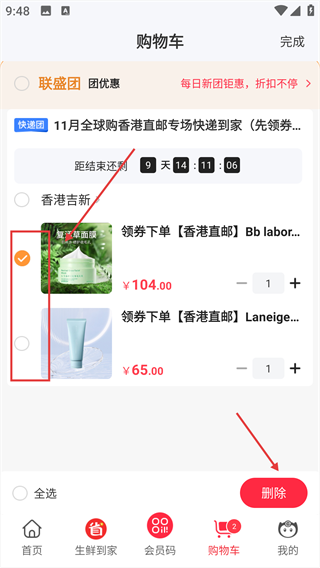 3、勾选需要删除的商品,随后点击页面底部的“删除”按钮。