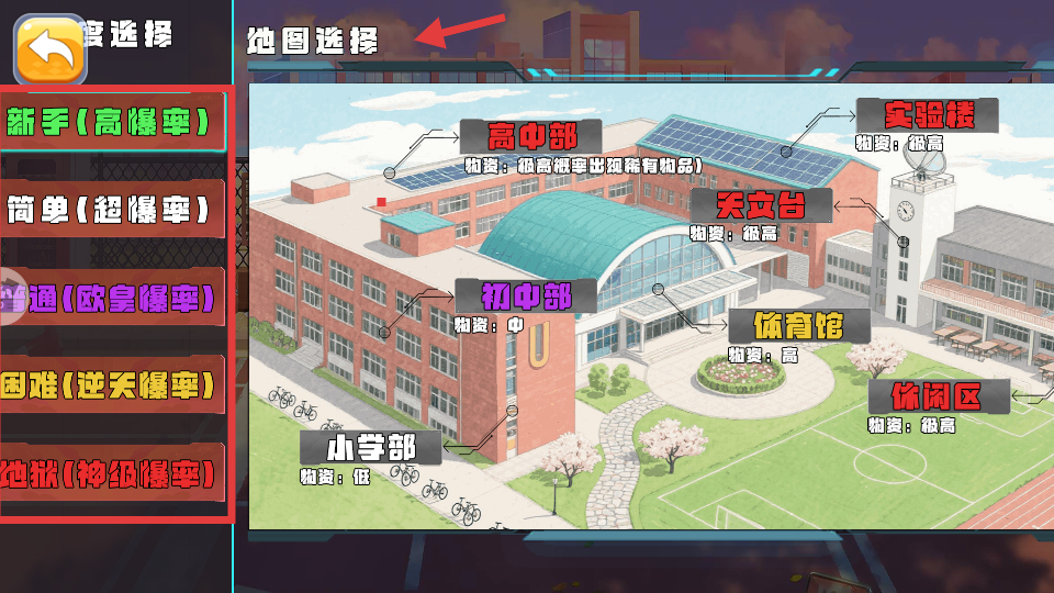 2、左侧选择适合的难度(如【新手(高爆率)】),右侧点击想要探索的地图区域(如【高中部】)。