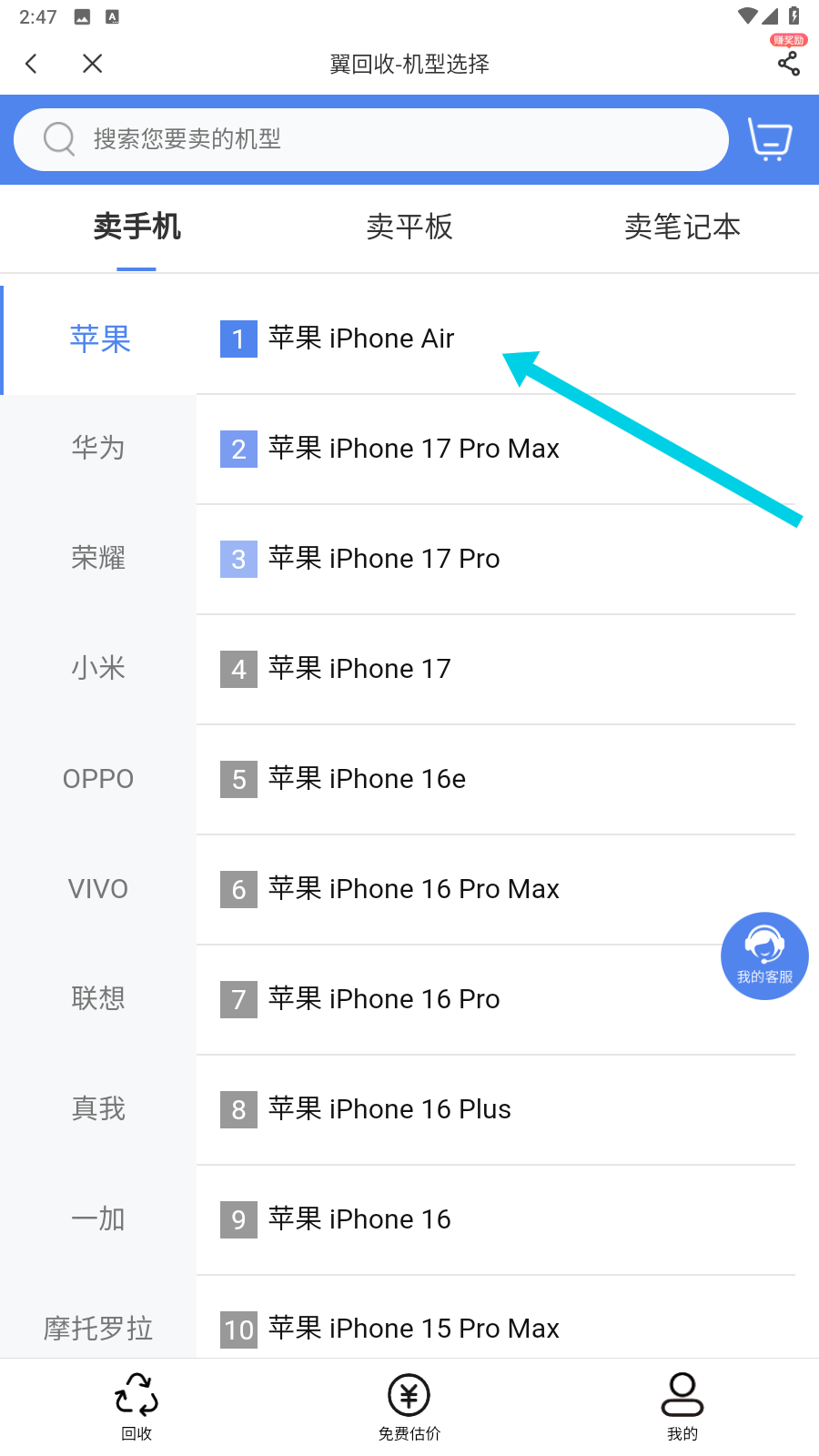 2、进入手机回收页面后,选择要卖的机型,如【苹果-iPhone-Air】,为估价做好准备啦。
