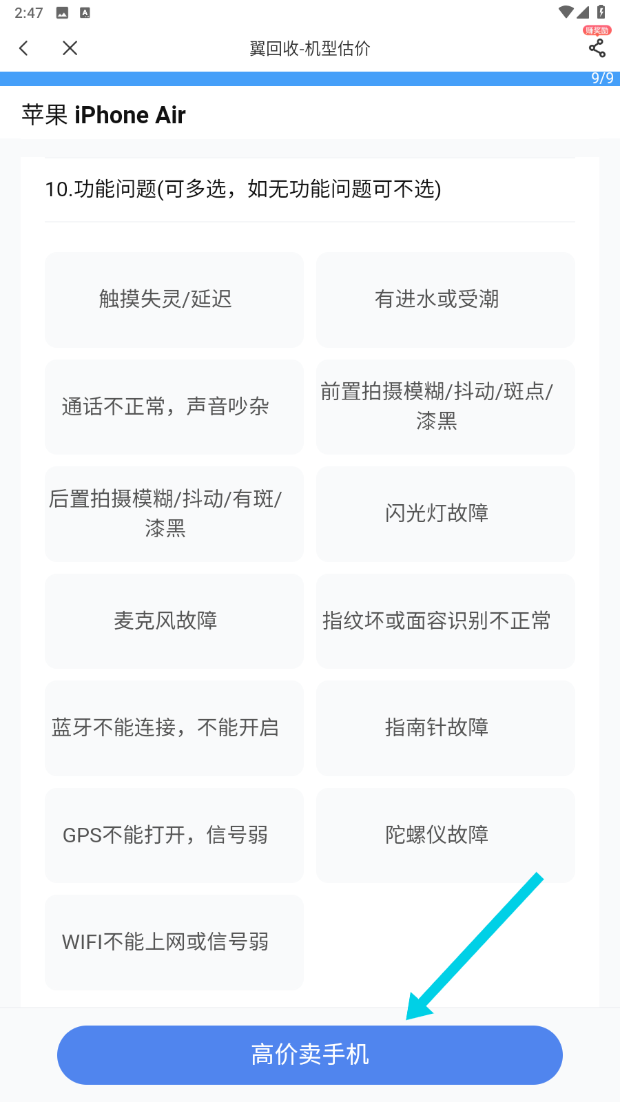 3、在机型估价页面,根据手机实际情况选择功能问题后,点击【高价卖手机】,就能看到估价结果咯。