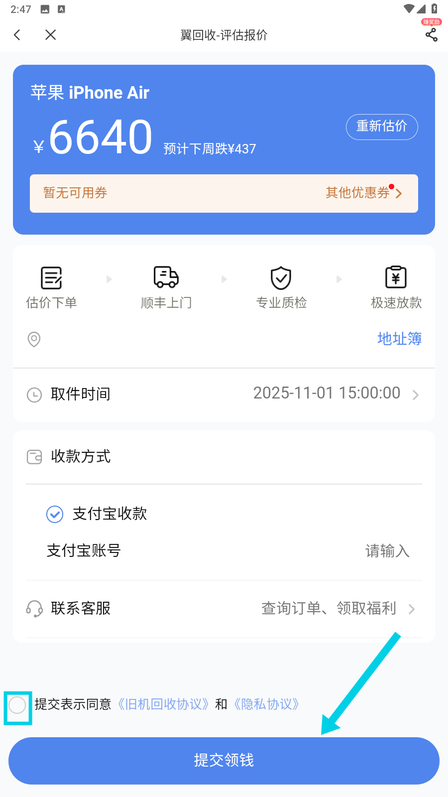 4、在评估报价页面,勾选同意协议后点击【提交领钱】,即可完成手机回收的提交操作哟。