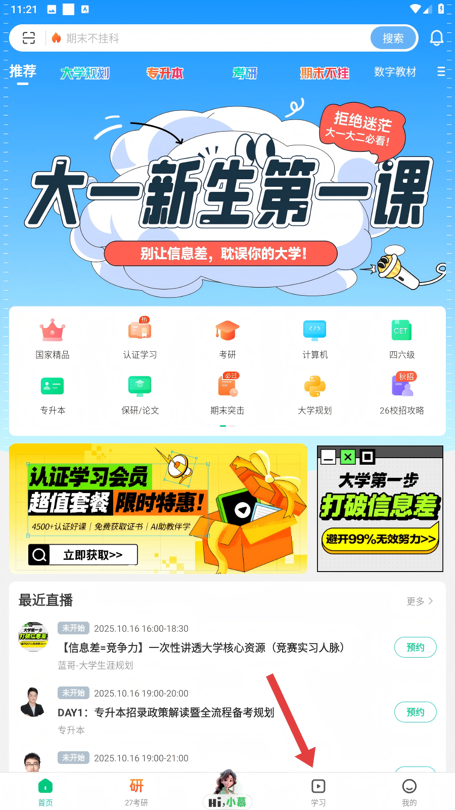 1、打开中国大学MOOC,首页能看到考研等功能,想加入慕课堂的话,先点击底部【学习】按钮哦。
