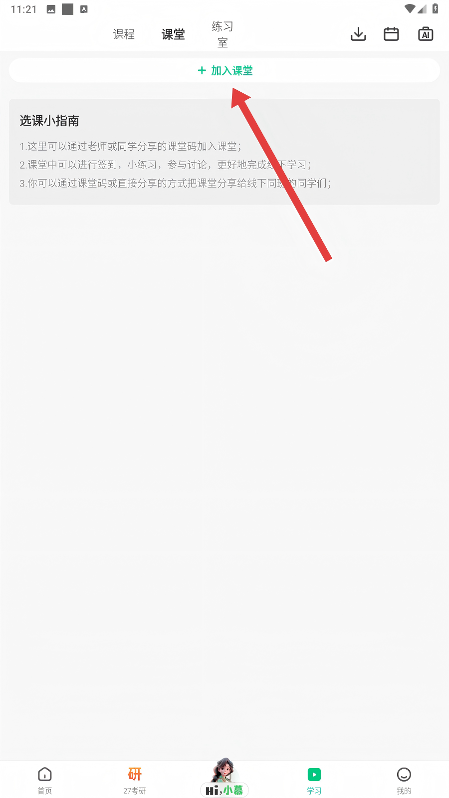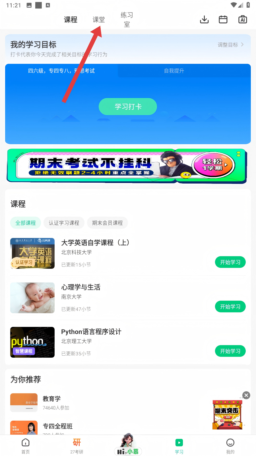 2、进入【学习】页面后,点击顶部【课堂】选项卡,就能进入课堂相关页面啦。