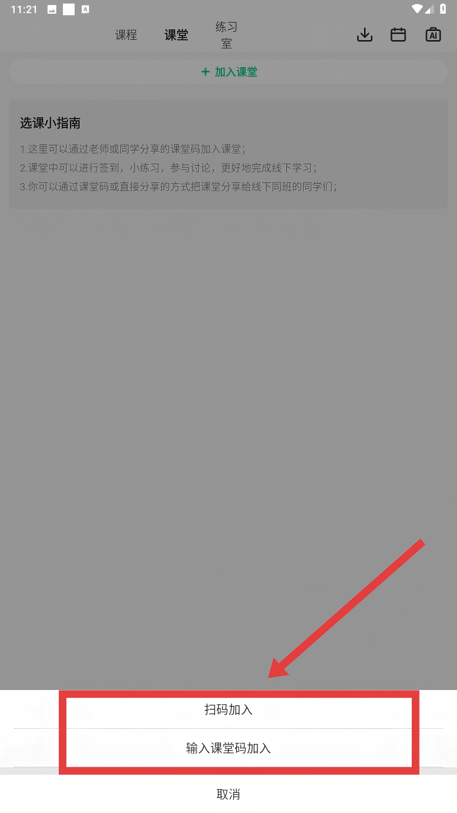 4、点击【加入课堂】后,能选择【扫码加入】或者【输入课堂码加入】,选其中一种方式就能加入慕课堂咯。