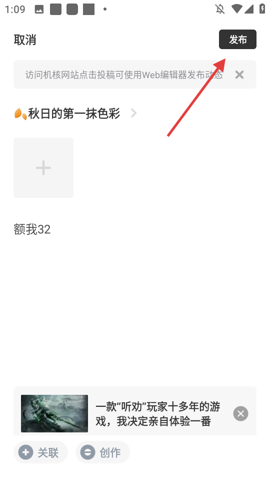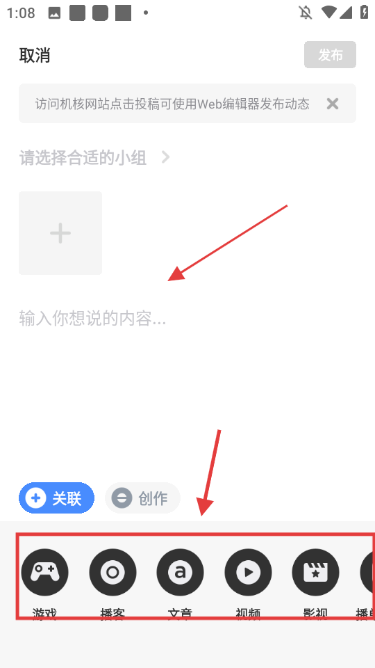 3、选择合适的小组,输入内容,可添加关联的游戏、播客等内容。