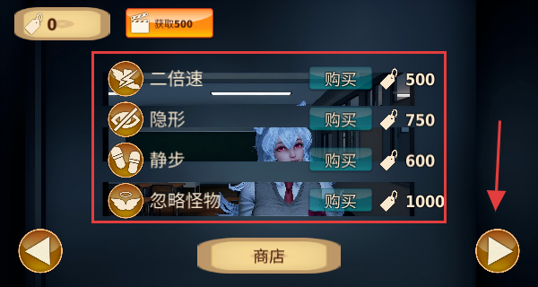 2、商店界面可购买【二倍速】【隐形】【静步】【忽略怪物】道具,需用对应货币【500】【750】【600】【1000】兑换。