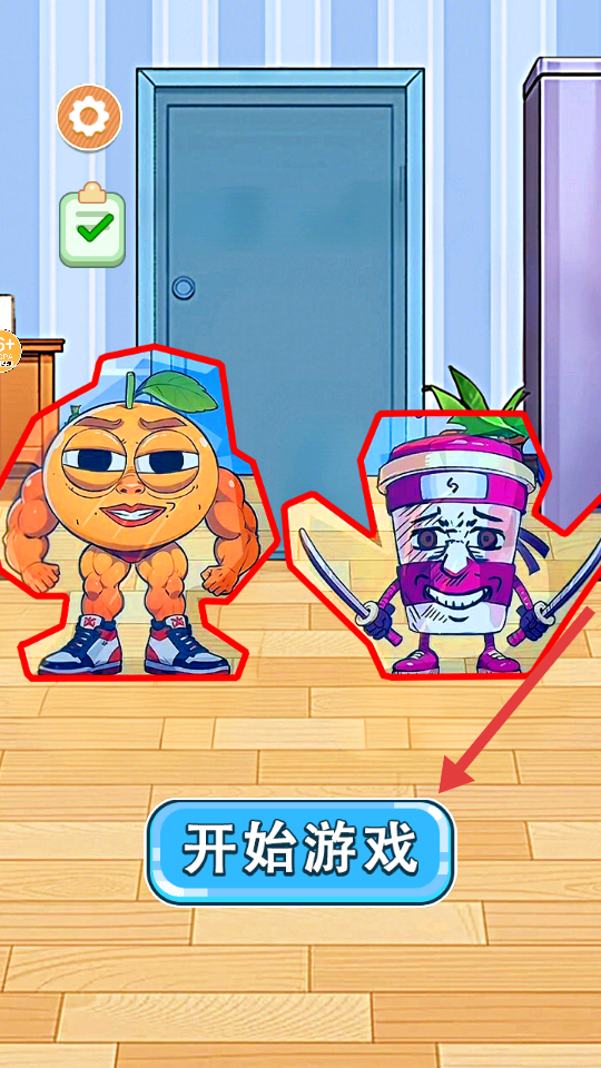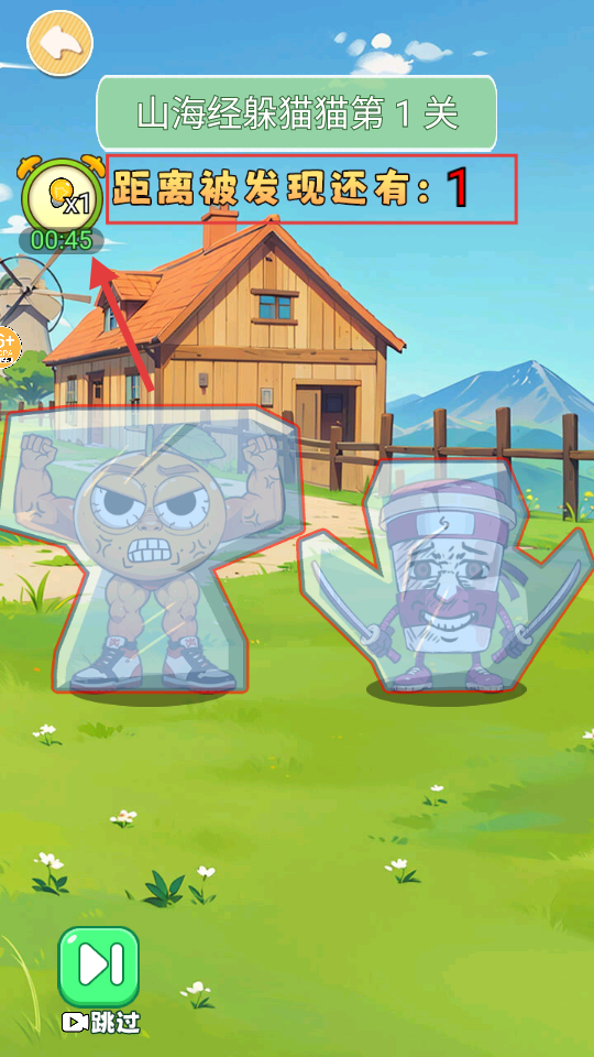1、初始界面有肌肉橙子与双剑杯装角色,点击下方【开始游戏】按钮进入【山海经躲猫猫第1关】。