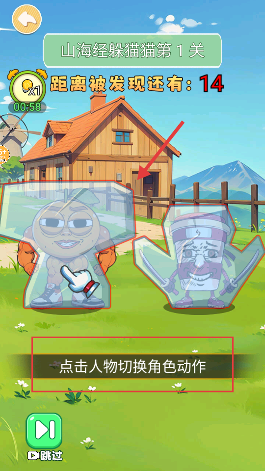 2、第1关界面,上方显示【距离被发现还有-14】倒计时,按提示点击人物切换【角色动作】。