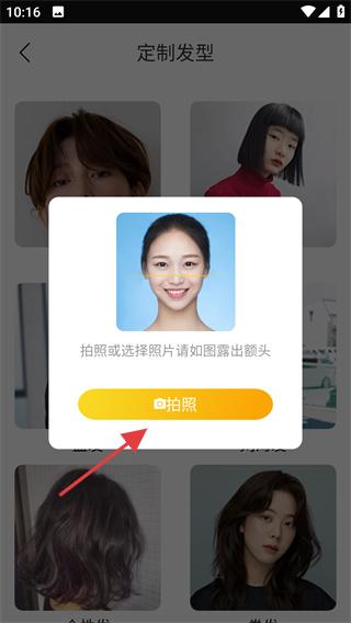3、在弹窗中点击【拍照】按钮,进入符合发型匹配要求的拍摄界面。