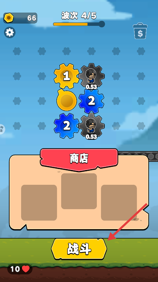 1、当前是【波次4-5】,金币有【66】,下方有【商店】界面,需点击【战斗】按钮进入下一波战斗。