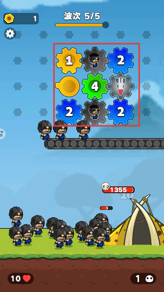 2、进入【波次5-5】,上方有【齿轮-1】【齿轮-2】【齿轮-4】组合,下方敌人来袭,需关注【骷髅-1355】的敌方数值。