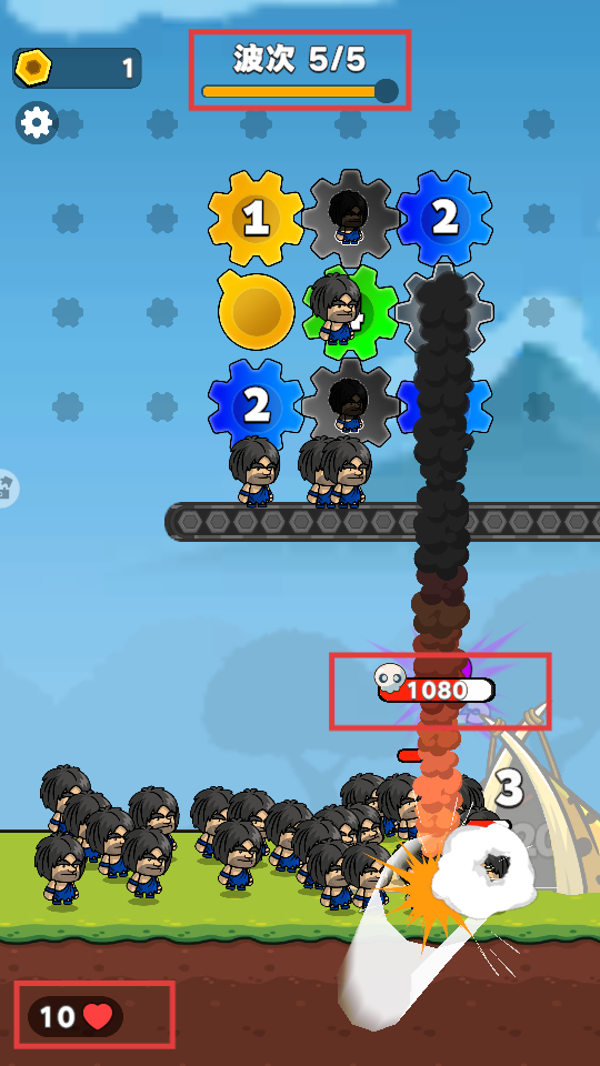 3、战斗中敌方【骷髅-1355】降至【骷髅-1080】,需利用上方齿轮组合持续攻击下方聚集的敌人。