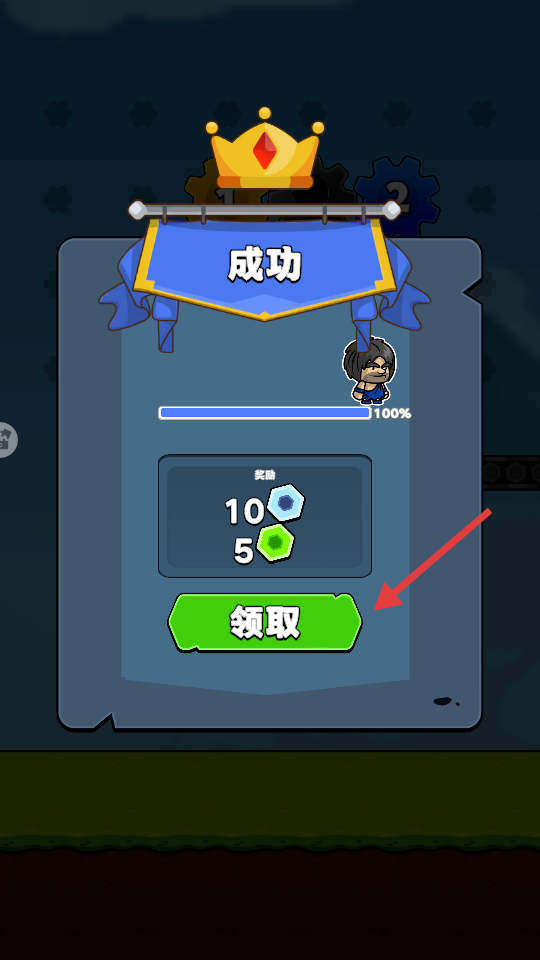 4、战斗成功后弹出【成功】界面,奖励是【10-六边形道具】和【5-绿色齿轮道具】,点击【领取】按钮获取奖励。