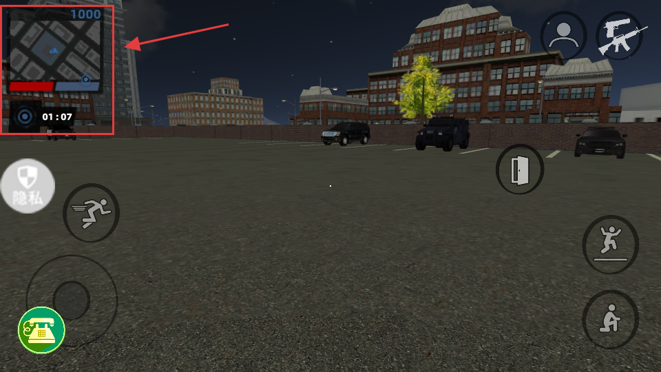 3、游戏中关注左上角的【地图-1000】和【倒计时-01:07】,依地图找目标并注意时间。