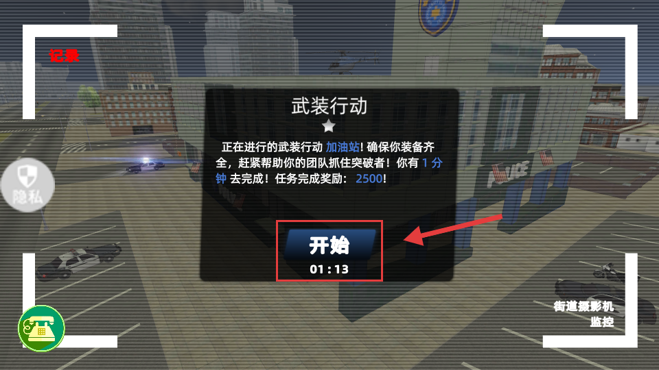 2、触发【武装行动】任务弹窗后,点击红色框内的【开始-01:13】按钮,开启抓突破者任务。
