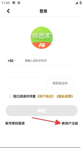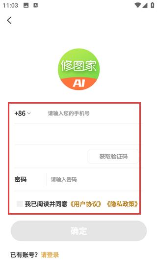 4、在注册页输入手机号码,点击【获取验证码】,将收到的验证码填入对应位置,再设置密码,点击【确定】,即可完成新账号注册。