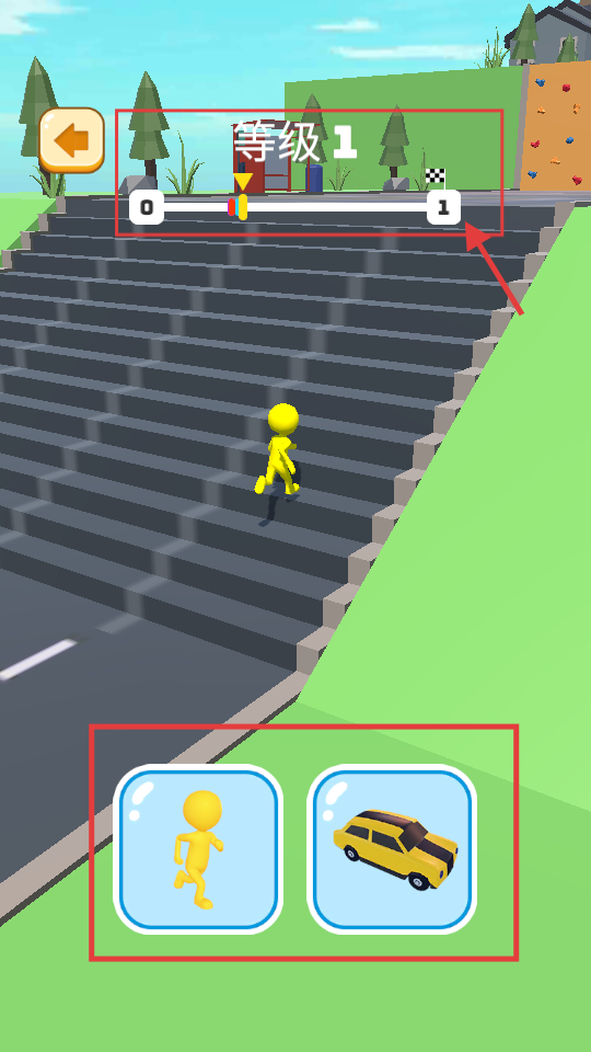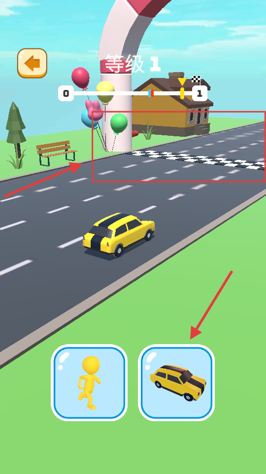 2、根据【等级1】进度条提示,选择下方【跑步-小人】或【汽车】作为移动方式。
