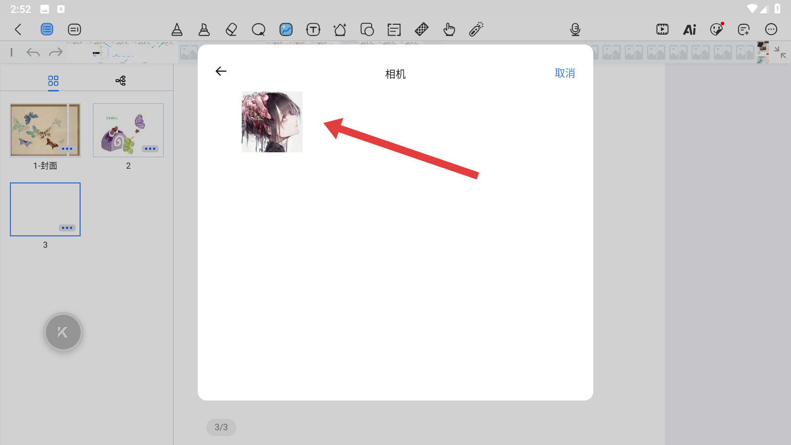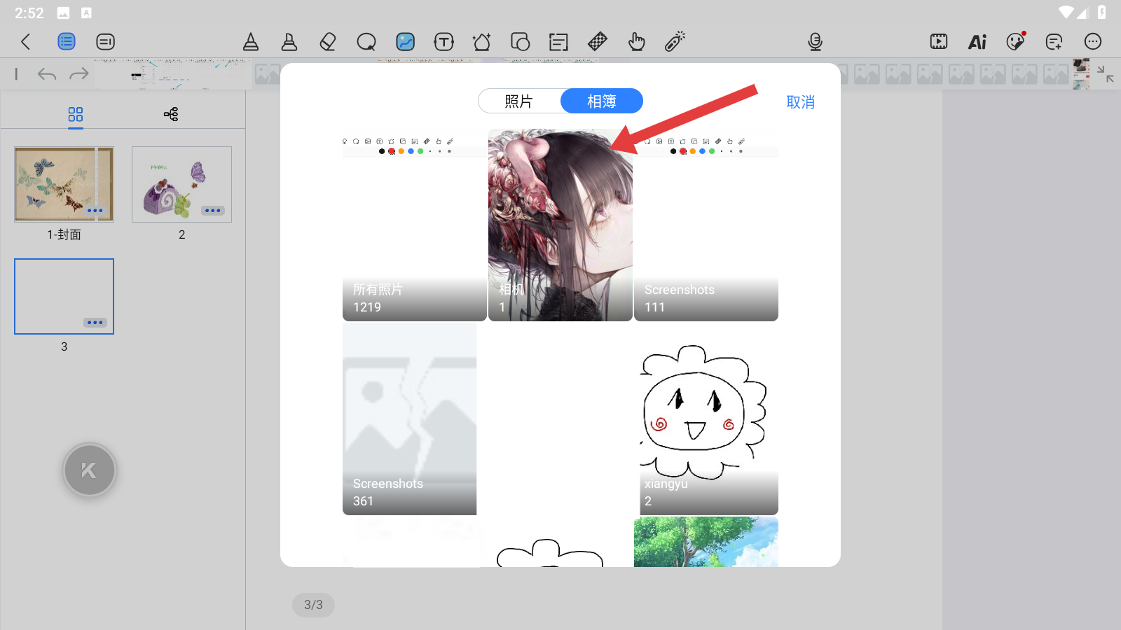 1、我们可以点击顶部的插入图片图标,进入【相簿】选择界面,准备选取要剪裁的图片呢。