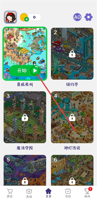 1、点击夏威夷州对应的开始按钮,进入该场景的寻找关卡。