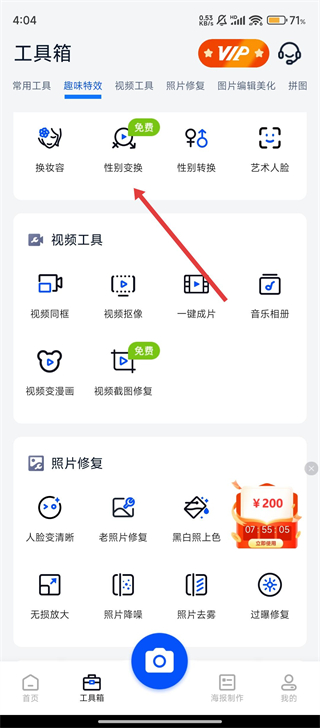 2、在工具箱的【趣味特效】分类下,点击【性别变换】选项,就能进入性别变换的编辑界面啦。