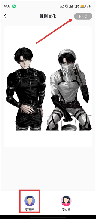 3、进入性别变换界面后,选择【变男神】或【变女神】风格,再点击【下一步】,即可生成效果哦。