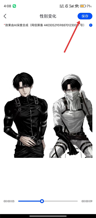 4、效果生成后,点击右上角【保存】按钮,就能将性别变换后的作品保存下来哦。