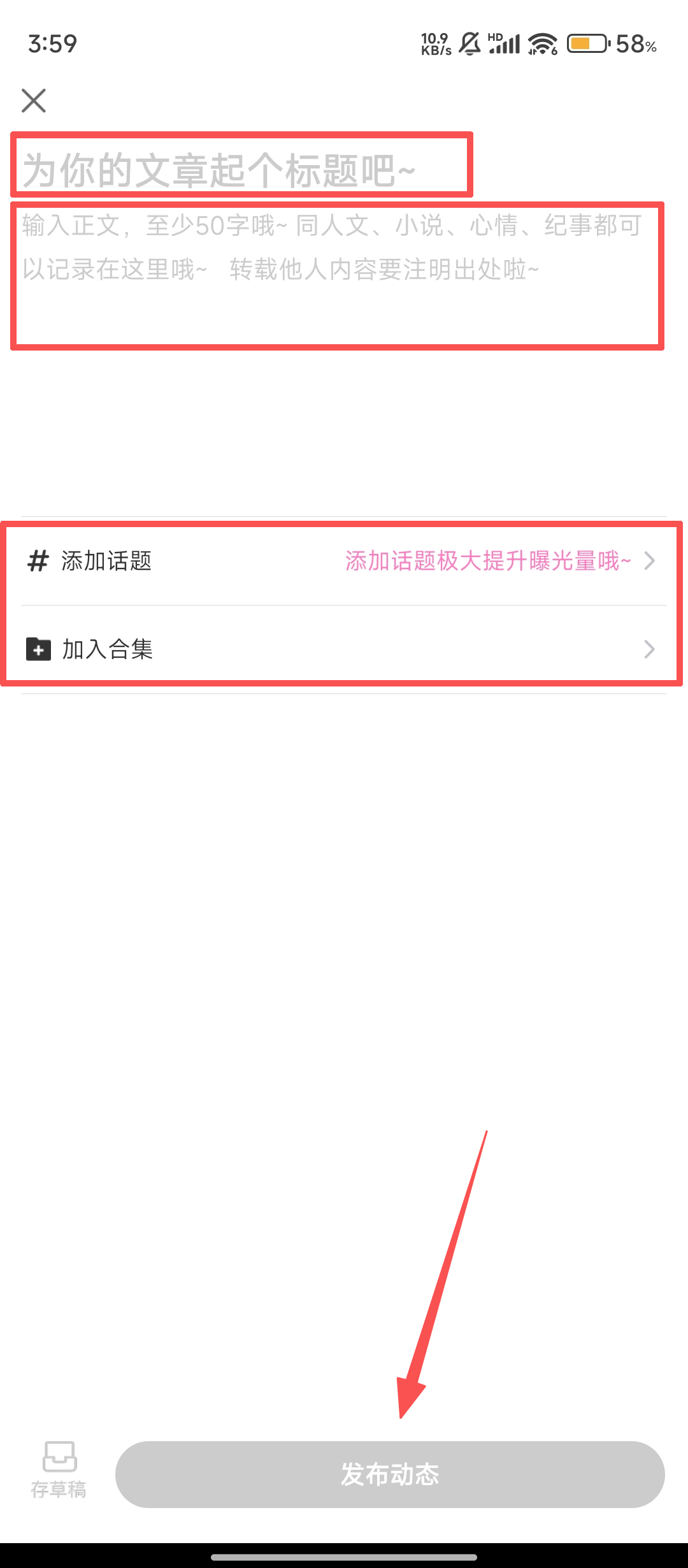 4、在创作界面,填写标题、正文,添加话题和合集后,点击【发布动态】,就能成功发布啦。