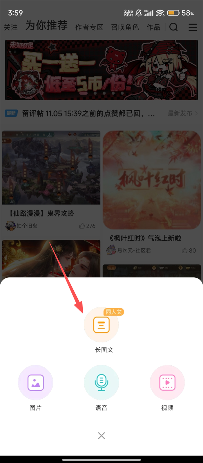 3、在创作选项中,选择【长图文】,进入动态创作界面呢。