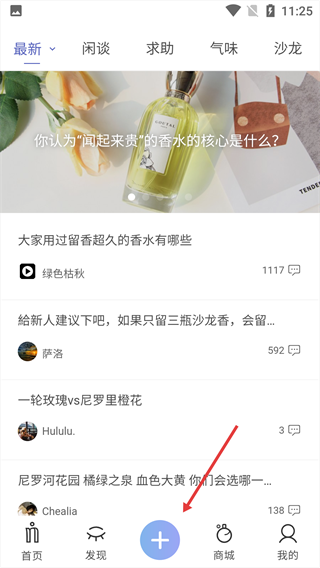 1、打开app,点击“圈子”选项,进入香水主题的圈子交流页面。