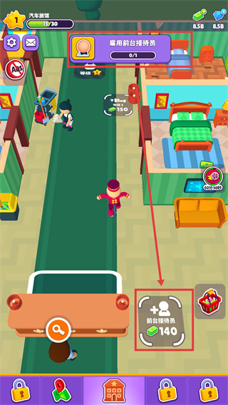1、雇佣前台接待员,前往对应图标花费【140】完成雇佣,提升酒店接待效率与整体服务能力。