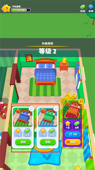 3、升级房间界面选合适床型,点击【获取】按钮获取家具,助力房间升级至等级2。