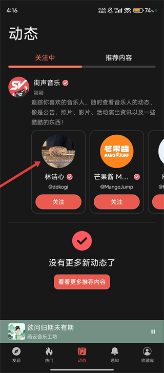 2、在动态的【关注中】页面,我们点击感兴趣的音乐人头像,比如【林洁心】,进入其主页啦。
