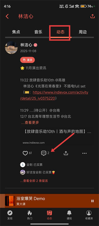 3、进入音乐人主页后,切换到【动态】标签,找到留言按钮,点击即可参与互动哦。