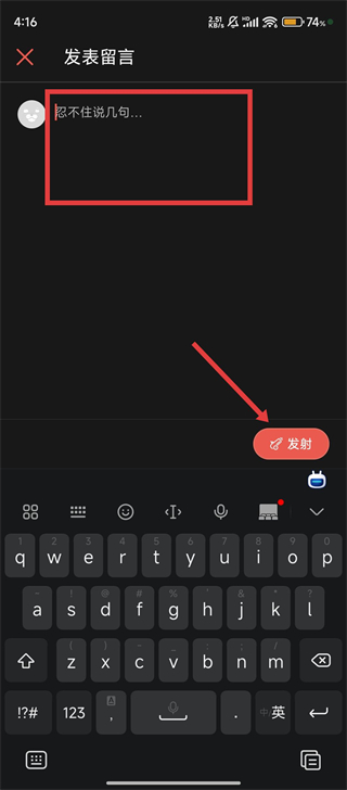 4、在发表留言页面,我们输入想说的话,然后点击【发射】按钮,就能成功与音乐人互动啦。