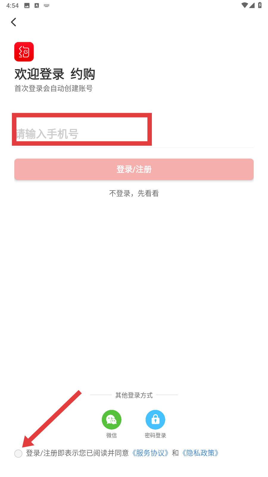 1、打开约购APP,勾选【登录/注册即表示您已阅读并同意服务协议和隐私政策】,在输入框输入手机号呀。