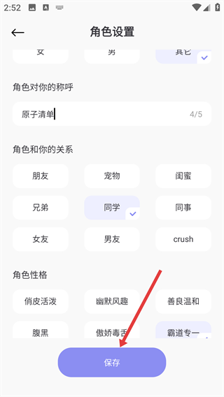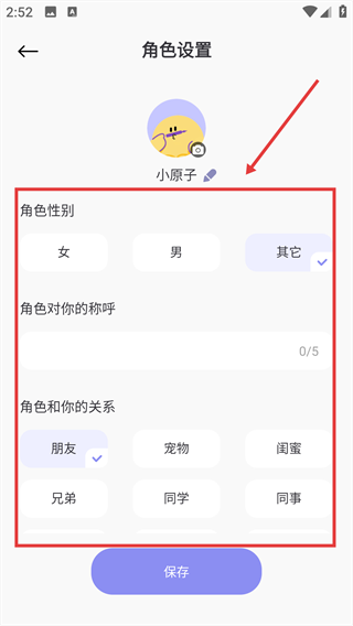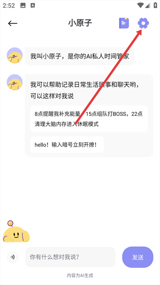 2、在小原子的聊天界面,点击右上角的设置图标,进入角色设置页面。