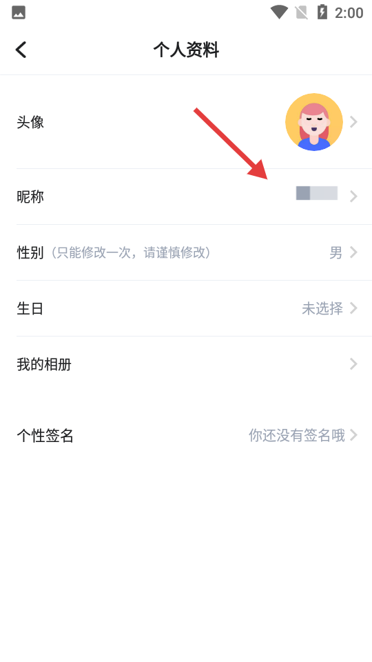 3、在个人资料页面点击【昵称】选项,进入昵称编辑页面。