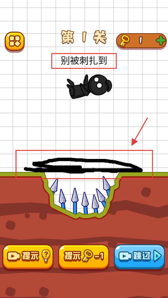2、在【第1关】的红色框内画封闭路径,覆盖下方的【尖刺】,避免角色被扎到。