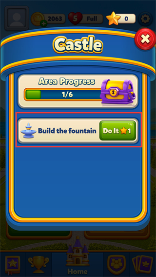 1、在【Castle】界面,点击【DoIt】按钮消耗1颗星星完成【Buildthefountain】任务,推进区域进度解锁新内容。