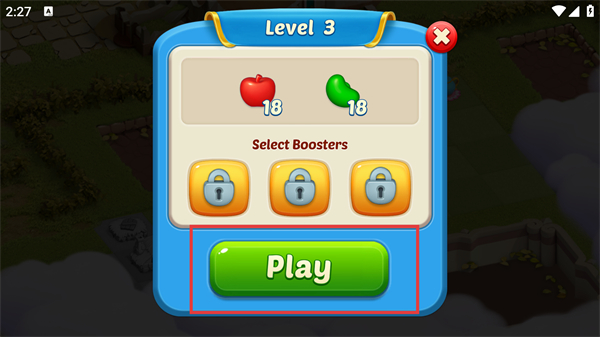 2、在关卡选择界面确认苹果和豆子的收集目标,点击Play按钮正式进入第三关的消除场景。