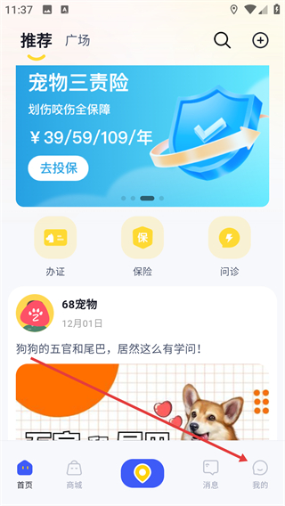 1、打开68宠物APP,点击我的。