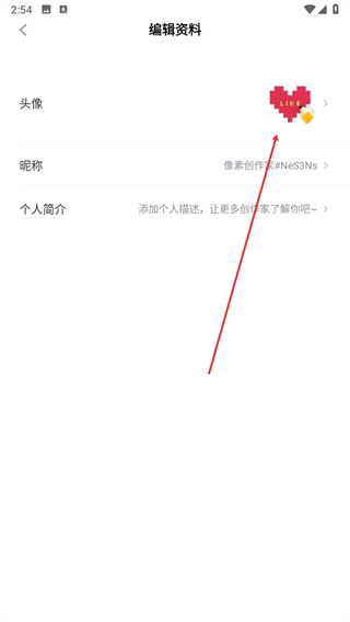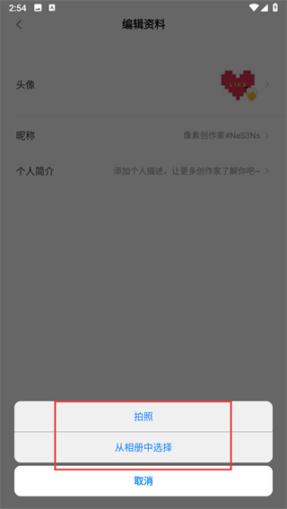 3、在编辑资料页面选择头像选项,点击后弹出操作选择菜单。
