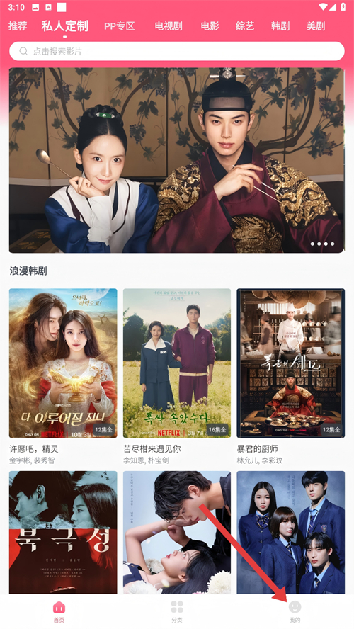 1、打开聚看韩剧网后,咱们点击页面底部的【我的】,就能进入个人页面啦。