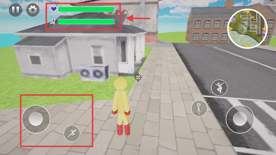 2、游戏内用左侧【虚拟摇杆】控制移动,点击【冲刺】图标加速,注意上方【爱心-血条】和【耐力条】状态。