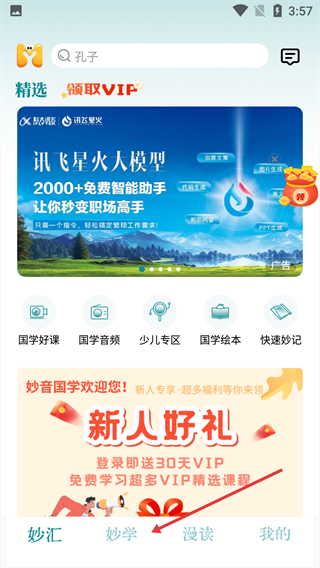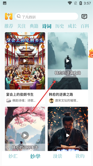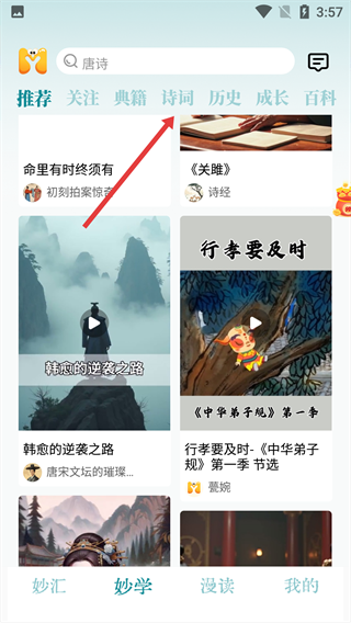 2、在妙学页面,点击顶部分类栏的【诗词】选项,切换至诗词类别的内容列表。