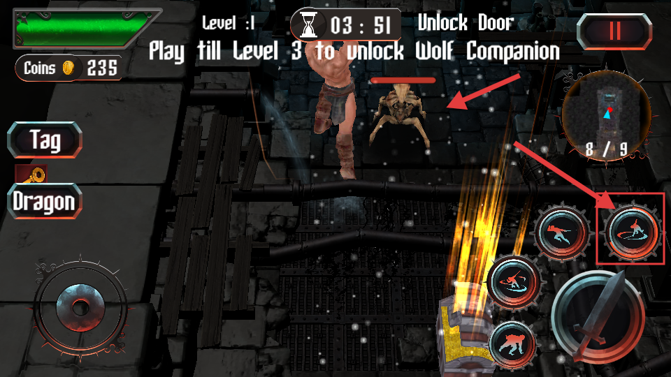 3、遇到难缠怪物时,点击右侧【旋转-技能】图标释放技能,快速清理敌人提高效率。