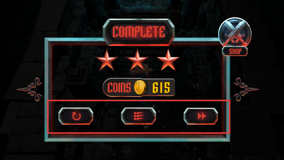 4、通关后根据需求选择【重玩】【菜单】或【下一关】按钮,所得【Coins-615】可去【Shop】购买道具。