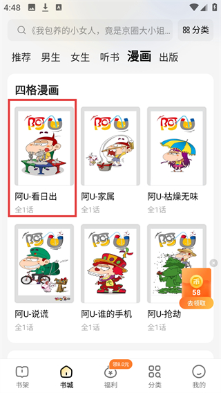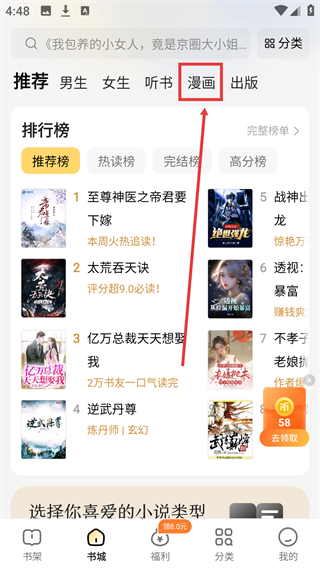 1、在【书城】页面,点击顶部【漫画】分类标签,即可切换至漫画内容的展示界面。
