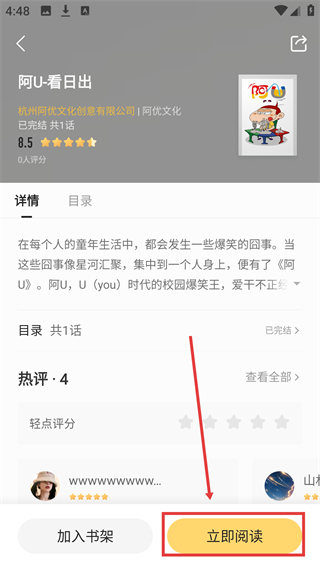 3、在【阿U-看日出】详情页,点击底部【立即阅读】按钮,即可进入该漫画的阅读界面。
