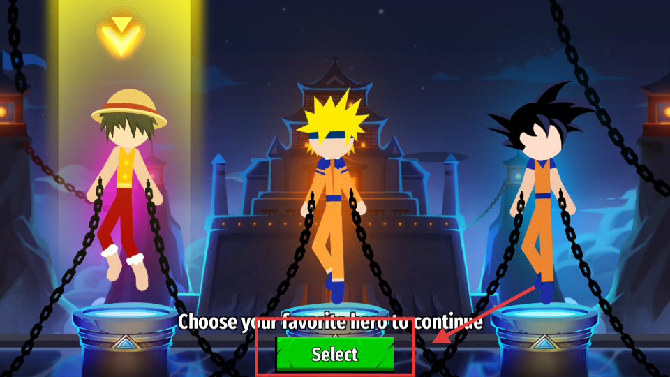 1、选择【Luffy】【Naruto】【Goku】中的英雄,点击下方绿色【Select】按钮开启战斗。